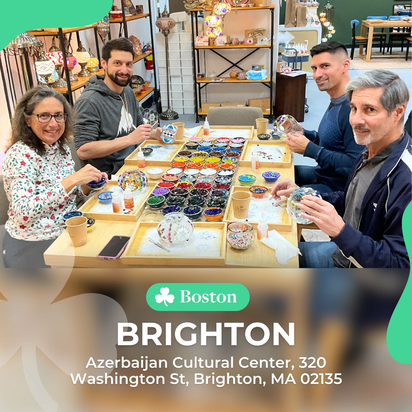 Feel the creative vibe in our workshop with handcrafted lamps and mosaics, guided by expert instructors.