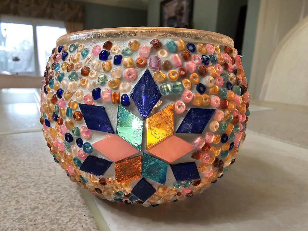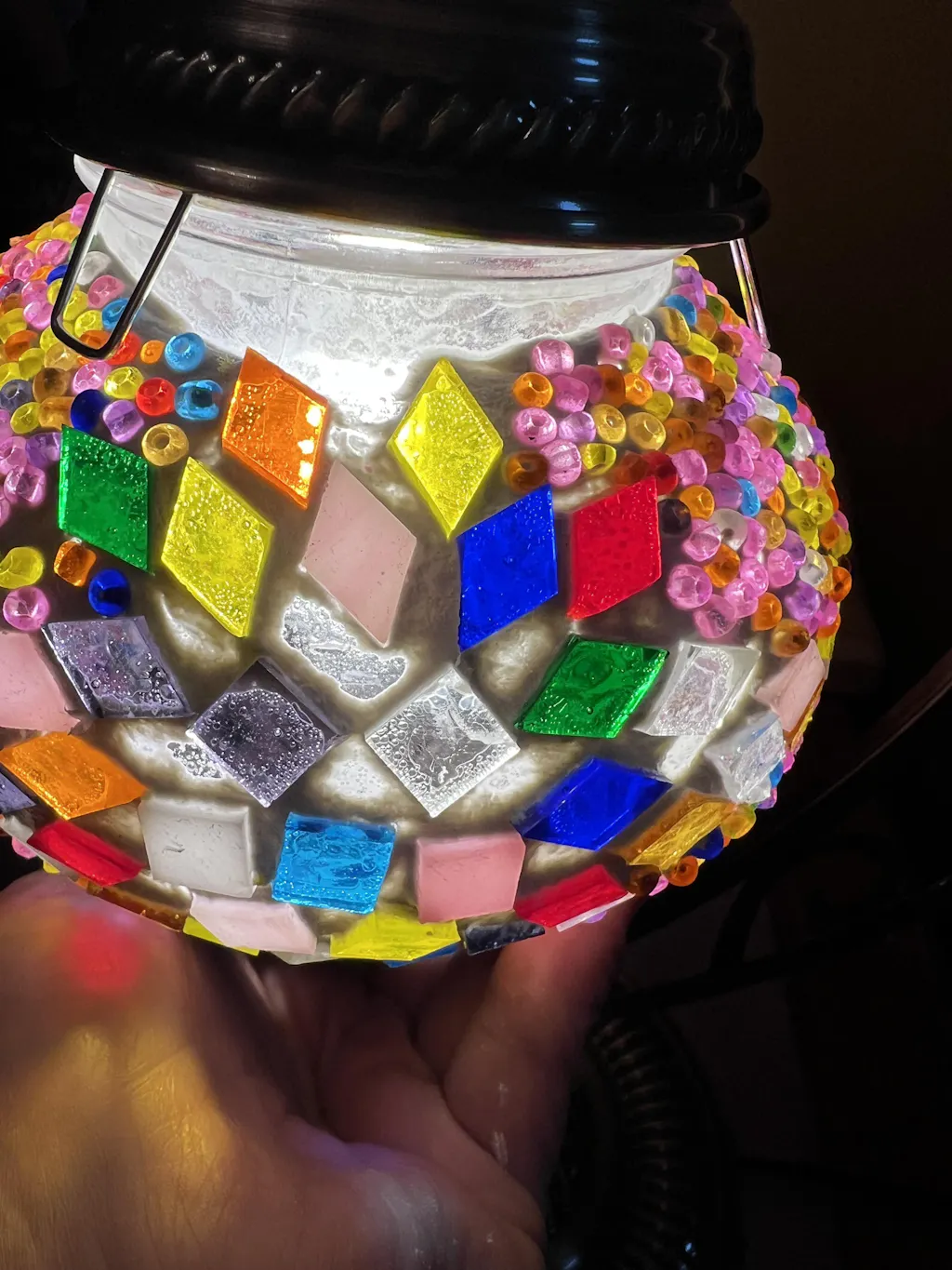 We use special adhesive and beads to strengthen your mosaic lamp and add a signature shimmering effect.