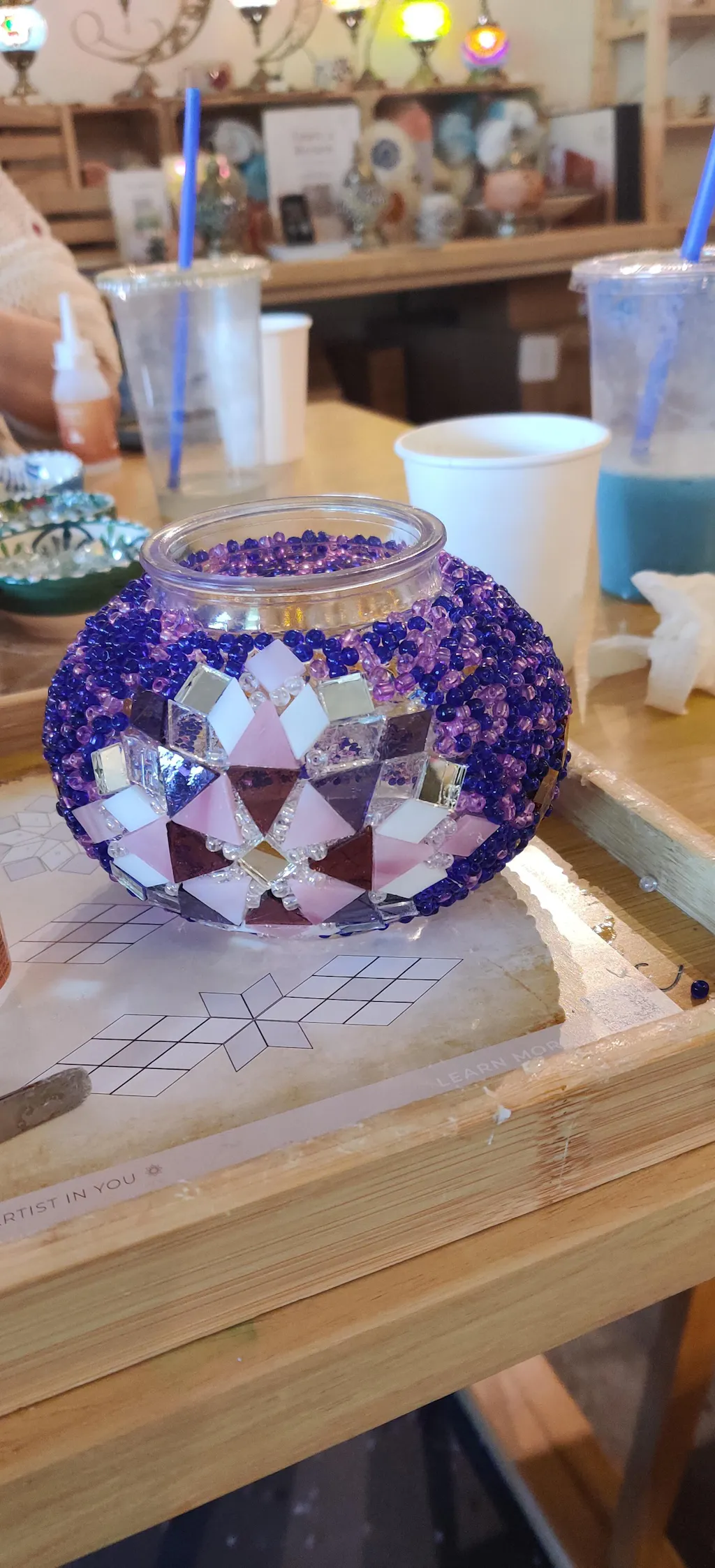 Once you've completed your project at the studio, bring the glass globe home and allow a minimum of 12 hours for the glue to fully dry. Then, apply the grout we've provided to finalize your masterpiece.