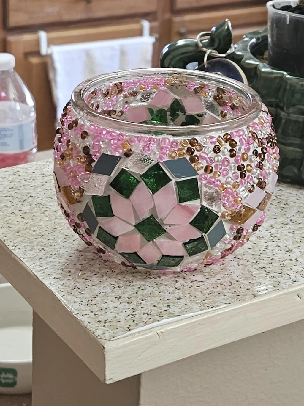 We use special adhesive and beads to strengthen your mosaic lamp and add a signature shimmering effect.