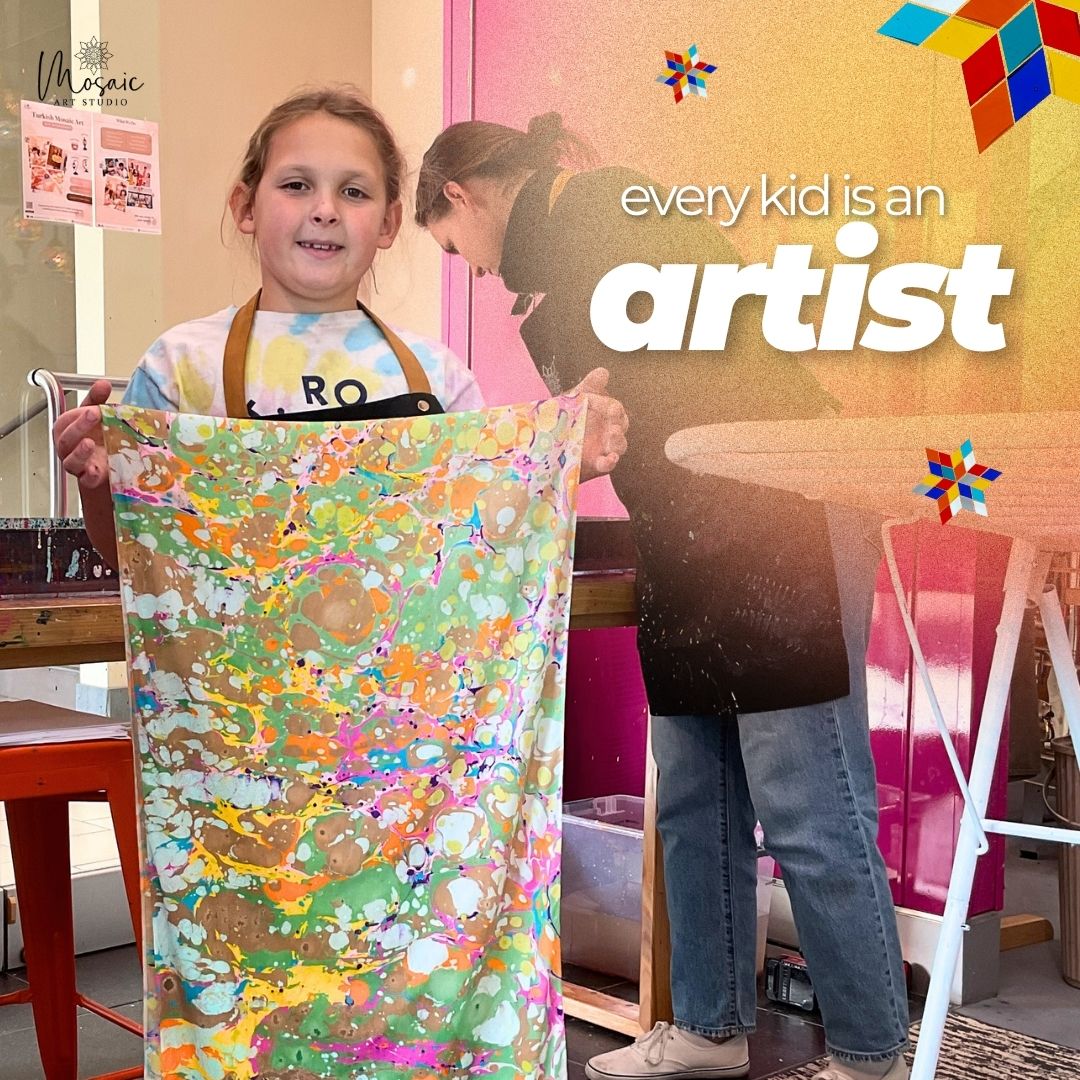 A hands-on creative experience where children explore mosaic art, Ebru marbling, ceramic painting, and plaster art — in a fun, supervised studio environment.