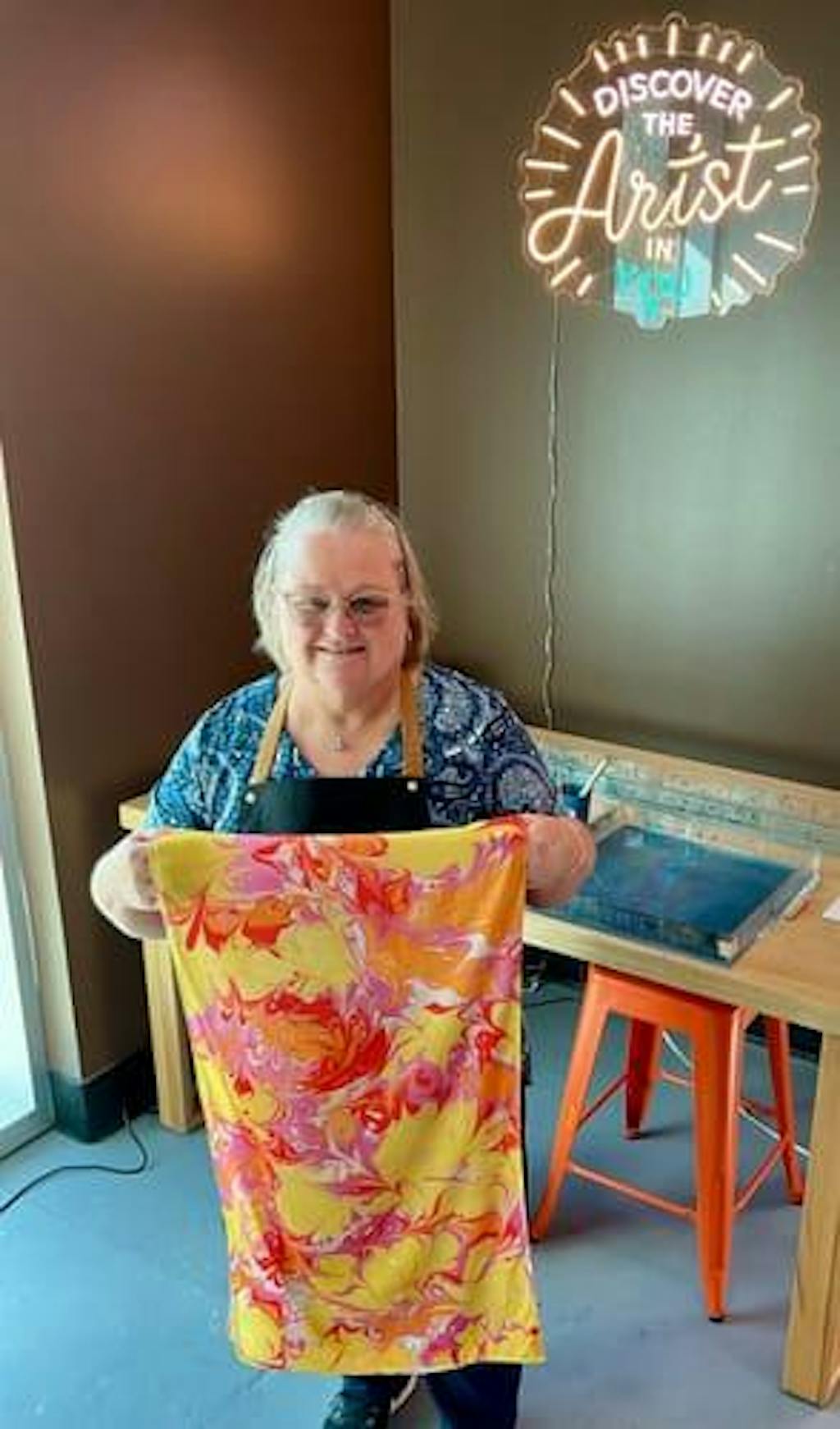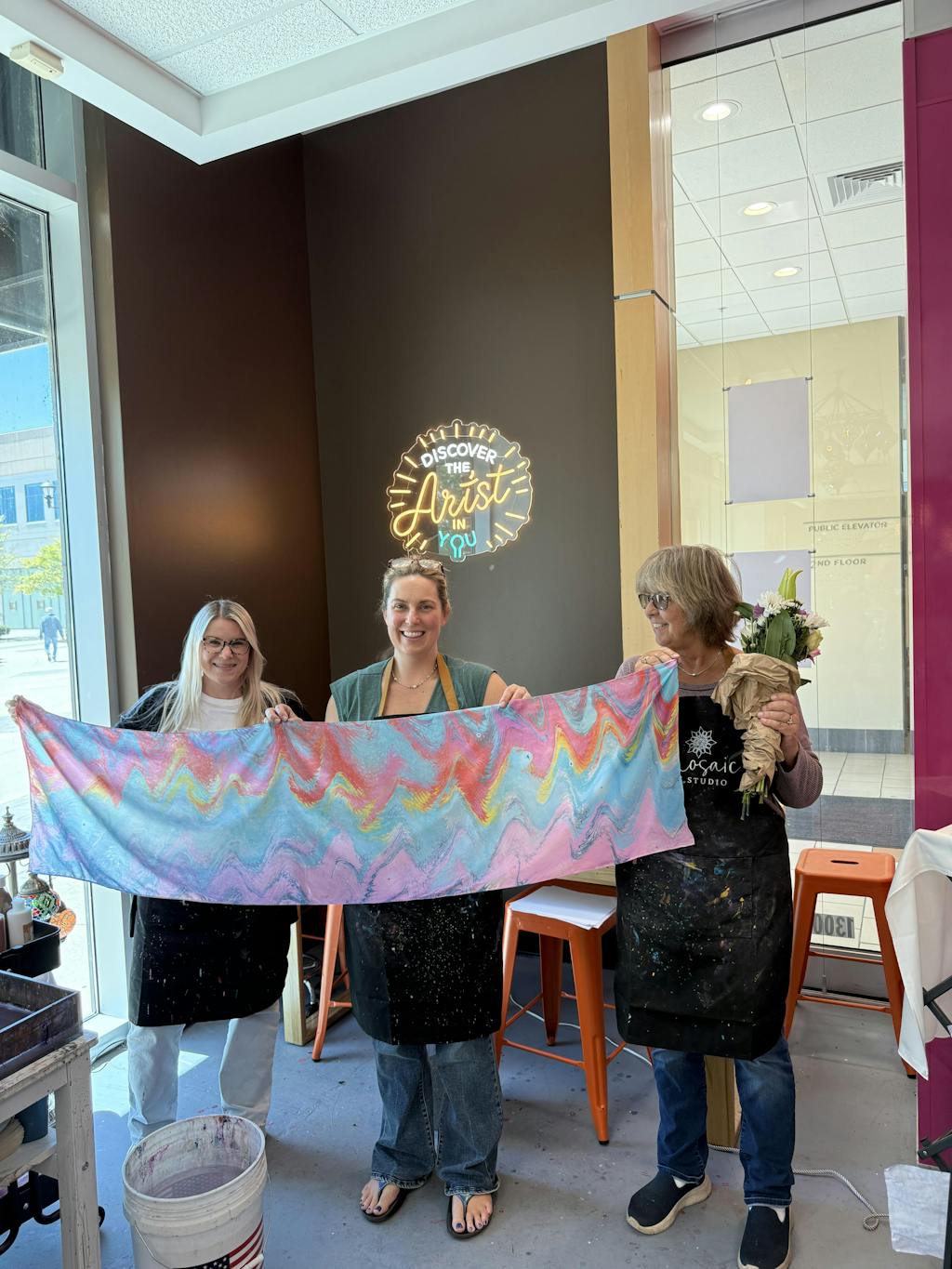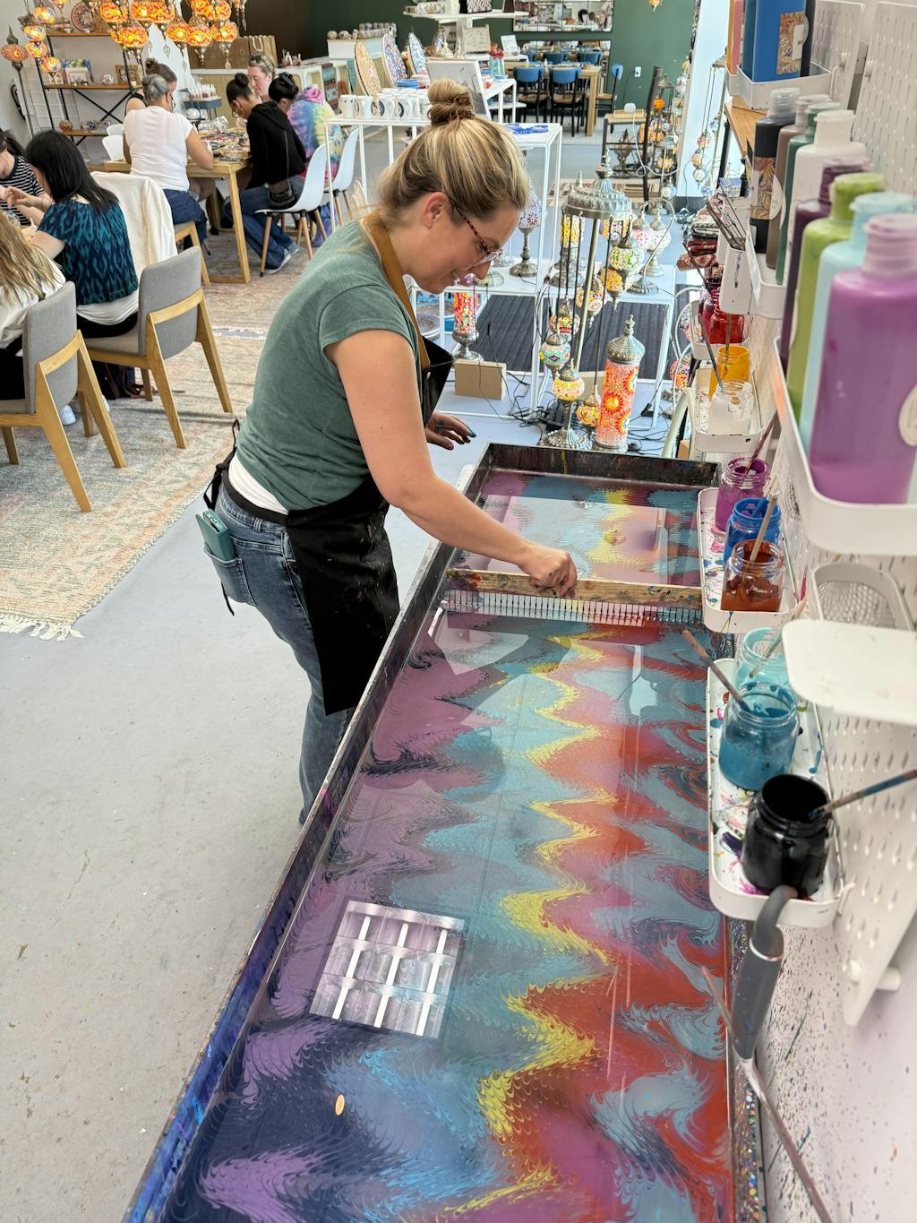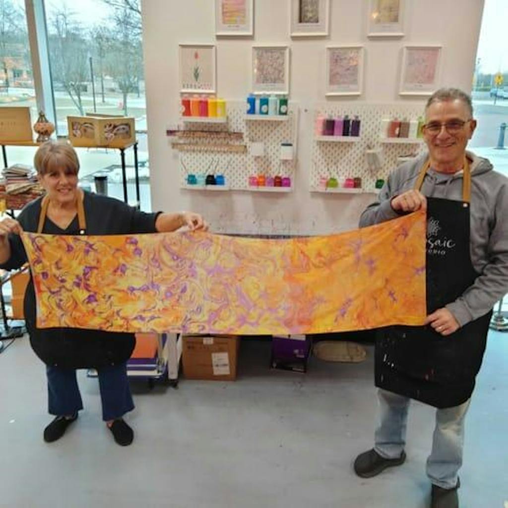My wife Justine and I had such a great time making our marble art scarf. Last year we made a mosaic lamp. Such a unique place! Something really different to do. Instructor was very professional and friendly. Looking forward to our next adventure.